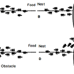 개미는 페로몬으로 길을 찾는다. 처음 가보는 길이더라도 동료들이 남긴 페로몬을 따라 먹이가 있는 곳까지 찾아간다. 뿐만 아니라 시간의 흐름에 따라 효율적으로 짧은 길을 찾아낸다. 개미가 지름길을 찾아낼 수 있는 것은 먼 거리의 경로 보다 짧은 거리의 경로에 상대적으로 같은 시간 안에 통과하는 개미가 더 많게되고, 더 많은 페로몬이 누적되기 때문이다. 아래는 시간의 흐름에 따라 개미가 짧은 길을 찾아내는 과정을 나타낸 그림이다. 장애물이 처음 나타났을 때 장애물을 돌아가는 양쪽 길 중 하나를 같은 확률로 선택한다면 더 짧은 경로에 더 많은 개미가 통과하게 되고 따라서 더 많은 페로몬이 누적되게된다. 시간의 흐름에 따라 긴 경로의 페로몬이 증발량이 누적량보다 많아지게 되면 점점 긴 경로를 선택하는 개미는 줄..